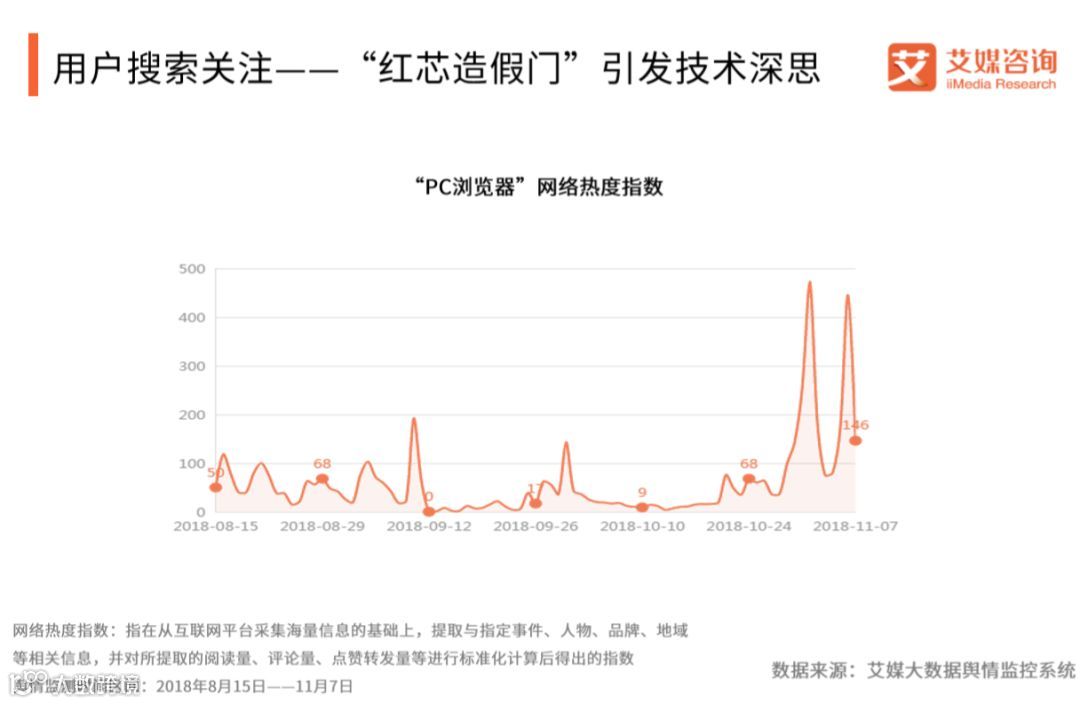 iiMedia Research(艾媒咨询)数据显示,近一个月“PC浏览器”话题热度指数波动幅度较大,2018年11月1日左右出现了话题高峰,11月份仍旧保持话题热度升高的态势。艾媒咨询分析师认为,“红芯造假门”事件引发了国内舆论对浏览器的关注,加之10月份谷歌、火狐、微软等品牌服务商纷纷做出行动,优化浏览器产品,优化服务与体验,使得浏览器的热度一度飙升。