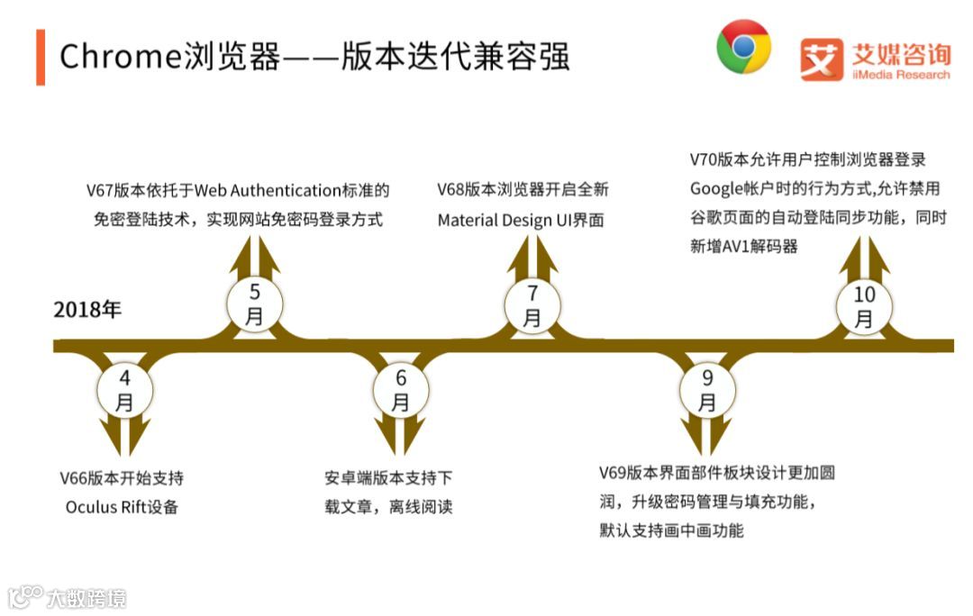 Chrome浏览器在2018年进行了多次版本更新,从V66版本支持Oculus Rift设备,协同享受WebVR服务,到V67版本的免密登陆,V68版本的全新UI设计,十周年系列V69的界面优化以及V70的同步控制与隐私保护功能,作为谷歌公司开发的浏览器,Chrome浏览器一直以其稳定性、速度和安全为用户称赞,产品简洁的界面与高效的服务让Chrome浏览器继IE之后在浏览器行业中占领一方市场。