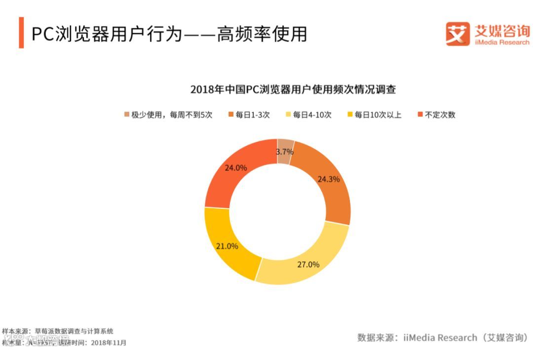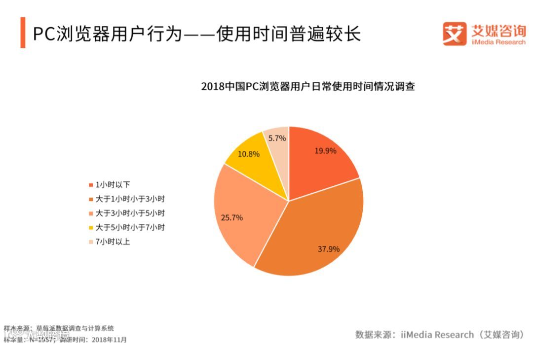 iiMedia Research(艾媒咨询)调研数据显示,在针对PC浏览器用户日常使用时间情况调查中,仅有19.9%的用户使用PC浏览器时间在1小时以下。艾媒咨询分析师认为,浏览器的功能仍是信息化社会中,解决用户疑难以及连接互联网服务的重要渠道和入口,用户对浏览器的依赖程度仍较大。