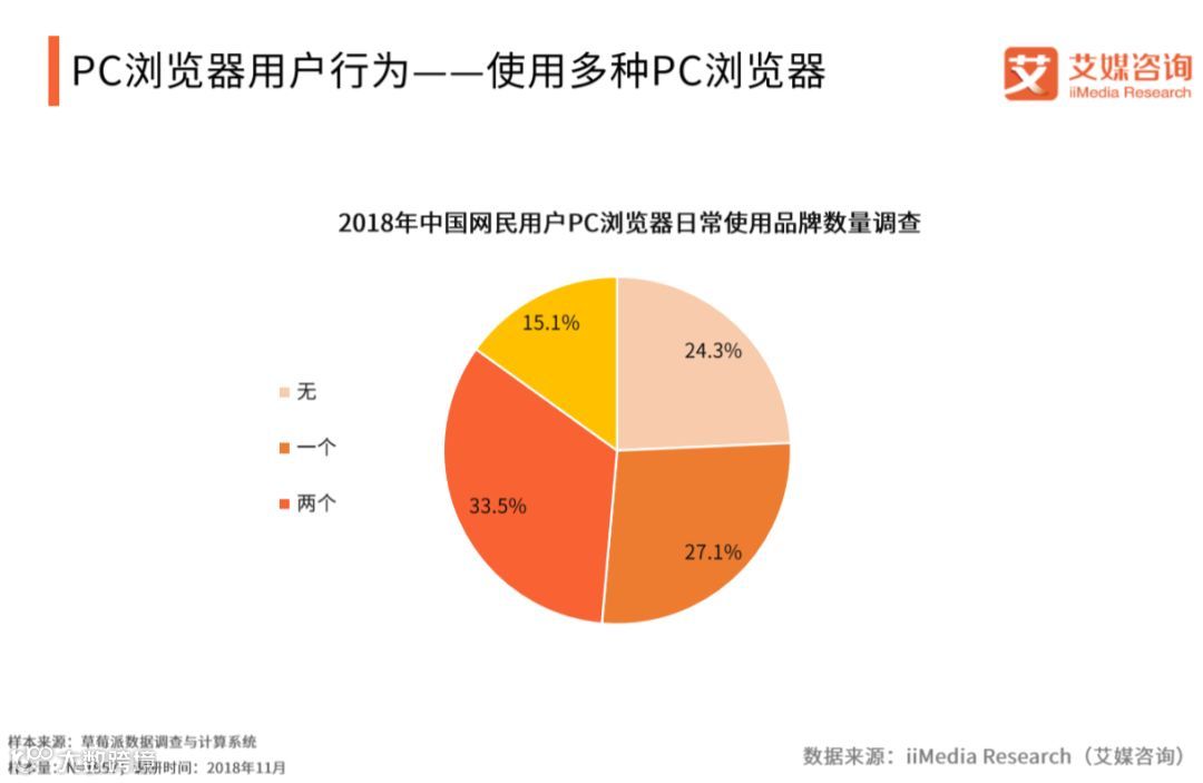 iiMedia Research(艾媒咨询)调研数据显示,在针对网民用户PC浏览器日常使用品牌数量调查中,33.5%的浏览器用户目前在电脑上使用两个浏览器,15.1%的用户使用了三个及以上。艾媒咨询分析师认为,用户对不同浏览器有不一样的体验,不同服务商浏览器产品也存在一定的差异,因此造成了用户会存在多个选择。