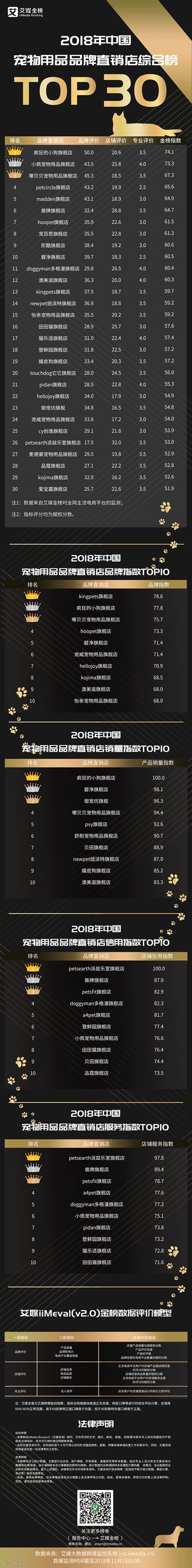 基于全网大数据监测和行业领先的品牌评价模型,艾媒金榜权威发布了《2018年中国宠物用品品牌直销店综合榜TOP30》,在产品销量、品牌影响力、电商平台覆盖程度、店铺信用和店铺服务等方面对宠物用品品牌直销店进行全面评价。
