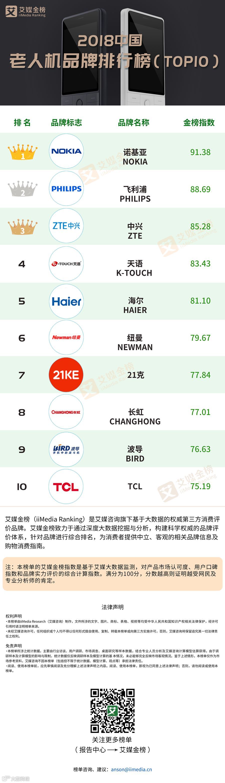 在高配、主流智能机盛行的时代,“老人机”市场依然热度不减。面对细分市场局势下的老人机市场行情,艾媒金榜(iiMedia Ranking)权威发布了《2018中国老人机品牌排行榜TOP10》榜单,艾媒金榜排名采用艾媒独有的iiMeval评价模型,结合品牌实力评价、产品市场认可度、用户口碑指数、分析师评价指数等多个维度针对品牌进行综合评价与排名。诺基亚、飞利浦、中兴、天语、海尔、纽曼、21克、长虹、波导、TCL凭借综合实力成功上榜。
