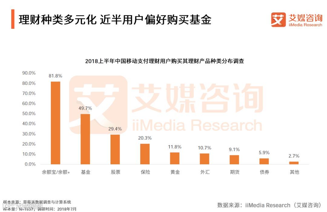 iiMedia Research(艾媒咨询)数据显示, 2018上半年,购买余额宝/余额+、基金(注:此处基金不包括余额宝/余额+的基金)理财产品的受访中国移动支付理财用户以以81.8%和49.7%的比例占据前两位。其中,购买移动支付理财产品中股票、保险的比例均高于两成。