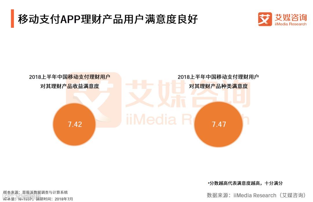 iiMedia Research(艾媒咨询)数据显示,2018上半年受访用户对移动支付APP理财产品收益的满意度为7.42,同时对移动支付理财产品种类满意度较高,为7.47。