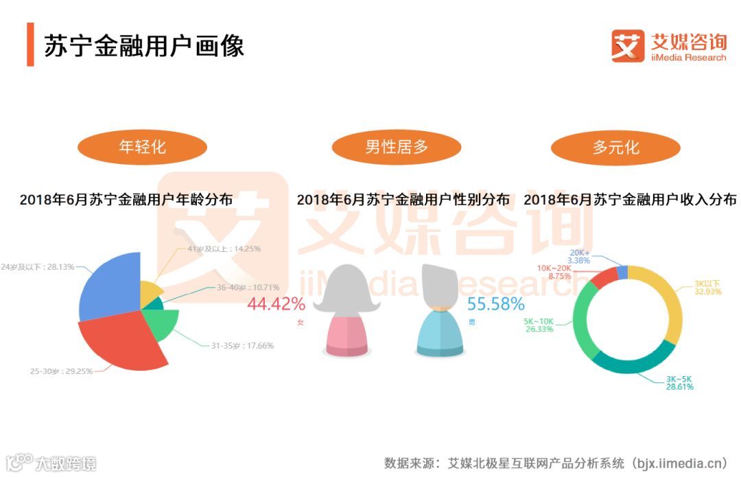 iiMedia Research(艾媒咨询)数据显示,苏宁金融用户男性居多,占55.58%,比女性用户多一成,用户普遍年轻化,30岁以下用户占57.38%。用户群体收入多元化,5k以下收入用户占比为59.26%。艾媒咨询分析师认为,苏宁金融用户分布较为广泛,中青年男性是其主要受众。