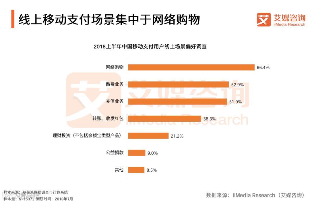 iiMedia Research(艾媒咨询)数据显示, 2018上半年,中国移动支付用户偏好网购及缴费业务线上移动支付场景,占比高达66.4%和52.9%。