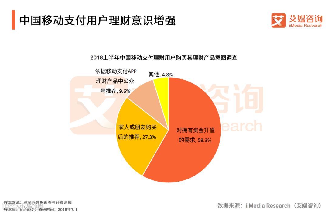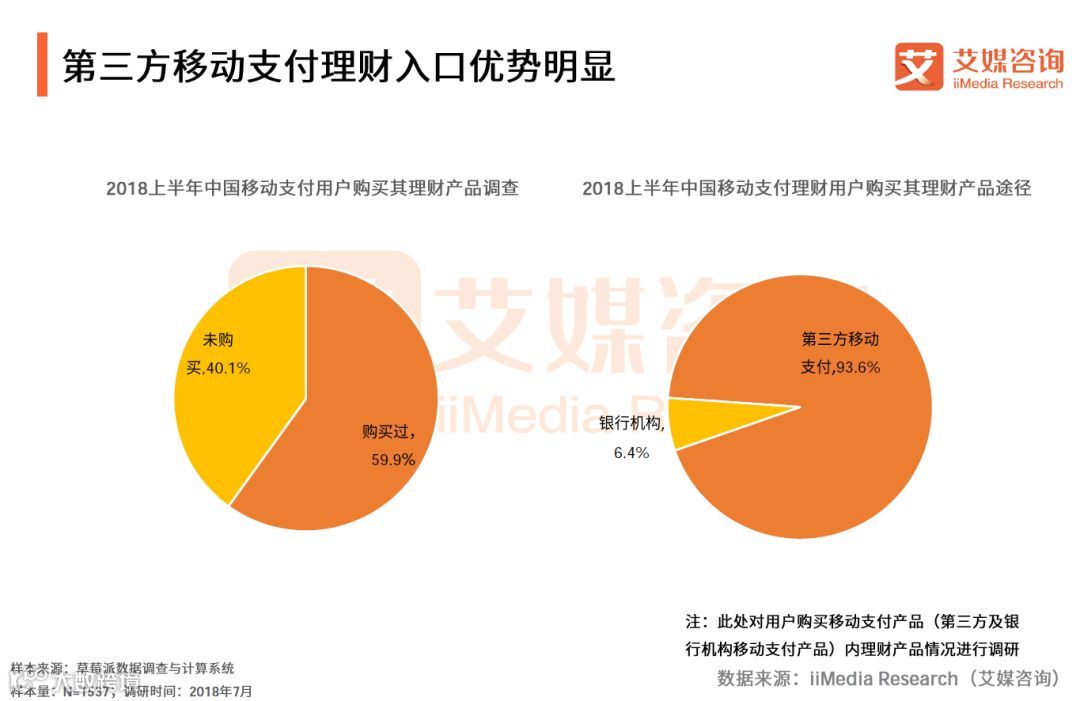 iiMedia Research(艾媒咨询)数据显示, 2018上半年,中国移动支付用户购买其理财产品的比例为59.9%。有93.6%的受访理财用户表示自己是通过微信、支付宝等第三方移动支付APP来购买理财产品。