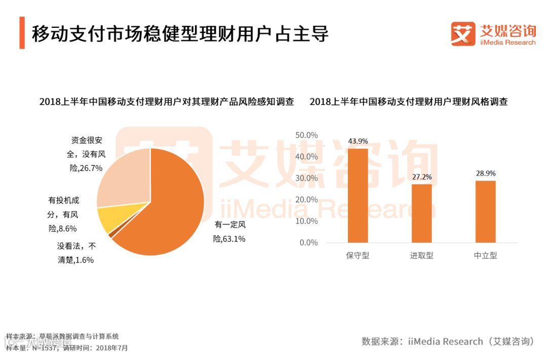 iiMedia Research(艾媒咨询)数据显示,2018上半年,中国移动支付理财用户有43.9%是属于保守型投资者,在购买移动支付APP理财产品时,倾向于规避风险,追求预期收益。有63.1%的中国移动支付理财用户认为,移动支付APP中理财产品有一定风险。