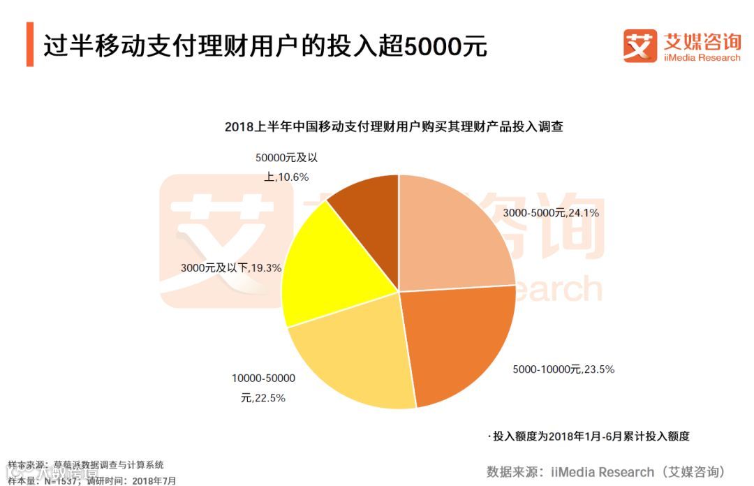 iiMedia Research(艾媒咨询)数据显示,2018上半年,投入资金超过5000元的受访中国移动支付理财用户达56.6%。其中,投入5000-10000元的占23.5%,投入10000-50000元的占22.5%,投入50000元以上的占10.6%。