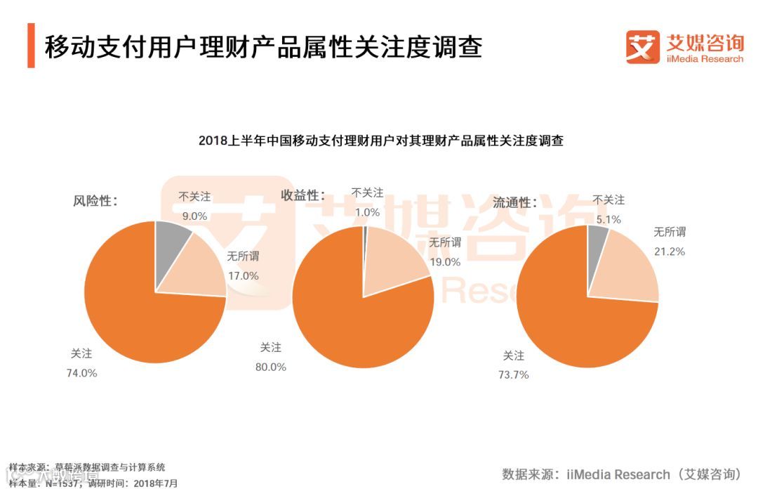 iiMedia Research(艾媒咨询)数据显示,2018上半年,中国移动支付用户中关注移动支付APP理财产品的风险性、收益性、流通性,占比分别达到74.0%、80.0%、73.7%。艾媒咨询分析师认为,移动支付APP理财产品的流通性、风险性与收益性是金融产品的固有属性,移动支付理财产品会在金融市场发展进程中,不断完善。