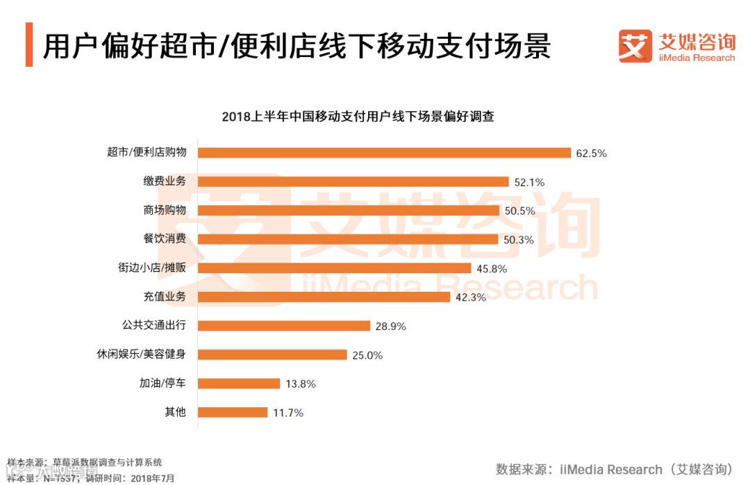 iiMedia Research(艾媒咨询)数据显示, 2018上半年,中国移动支付线下场景主要集中在超市便利店、缴费业务、商场购物,分别占62.5%、52.1%、50.5%。另外,达50.3%的受访网民偏好餐饮消费移动支付场景。