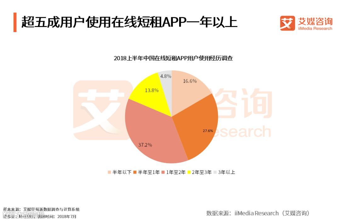 iiMedia Research(艾媒咨询)数据显示,2018上半年在线短租APP用户使用时长中,55.8%的在线短租用户使用一年以上,其中约两成用户使用超过两年。