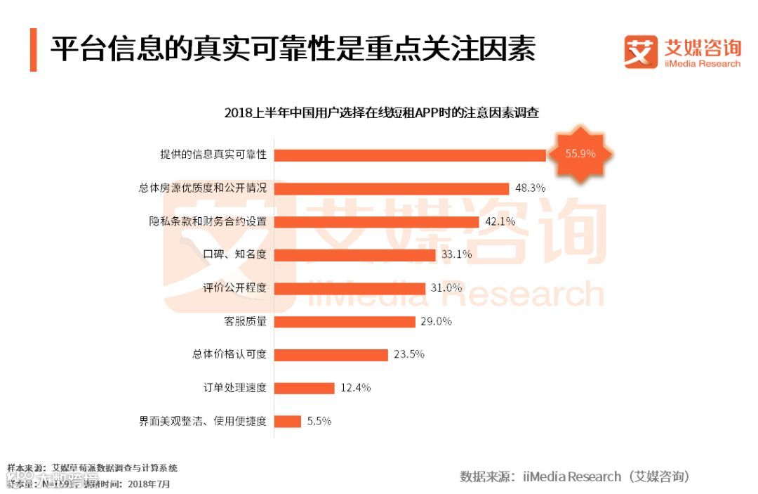 iiMedia Research(艾媒咨询)数据显示,在用户选择在线短租APP时的关注因素调查中,发现APP平台提供的信息真实可靠性以55.9%的比例成为用户最为关注的因素,总体房源的优质度与房源相关证明的公开情况和隐私条款与财务合约设置分别位列二三。艾媒咨询分析师认为,在线短租平台的远程交互性使得用户尤其关注信息的真实性和公开性。
