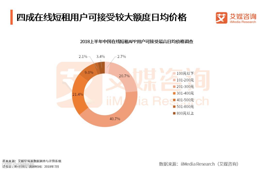 iiMedia Research(艾媒咨询)数据显示,2018上半年在线短租平台用户可接受最大日均价格调查中,40.7%的受访用户表示在线短租平台的单个房源最高可接受日均201-300元的价格。