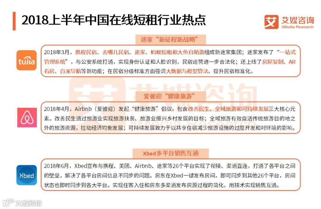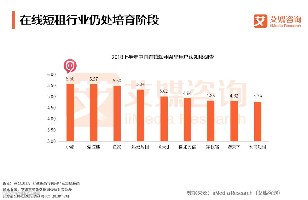 iiMedia Research(艾媒咨询)数据显示,2018上半年各在线短租APP用户认知度排名中,小猪短租位居首位,认知度为5.58,爱彼迎紧随其后,为5.57,途家和蚂蚁短租位列三四,通过互联网化运营以及技术驱动的在线短租平台Xbed也以5.02的知名度排名前列。艾媒咨询分析师认为,目前在线短租平台知名度普遍不高,仍有较大提升空间,行业仍未出现具有明显领先优势的企业,整体仍然处于培育阶段。