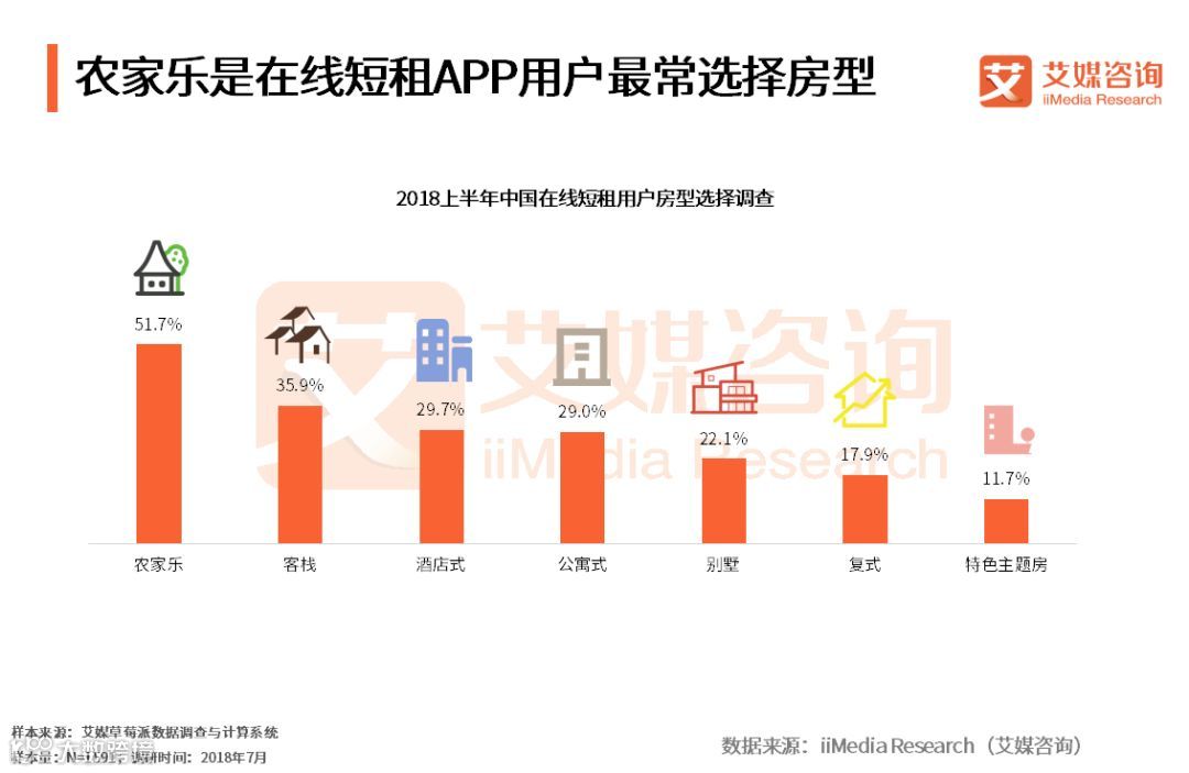 iiMedia Research(艾媒咨询)数据显示,2018上半年各在线短租APP用户房型选择中,51.7%的在线短租用户选择农家乐,其次,35.9%的用户选择客栈。酒店式、公寓式和别墅等房型选择分布较为均衡。
