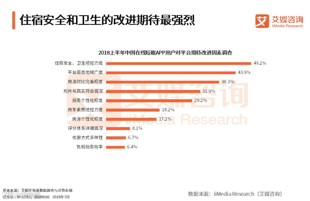 iiMedia Research(艾媒咨询)数据显示,2018上半年各在线短租APP用户对平台期待改进因素调查中,更加严格地把控住宿的安全和卫生是用户最期待短租行业得到改进的一项,49.2%的受访用户对其改进表示期待。