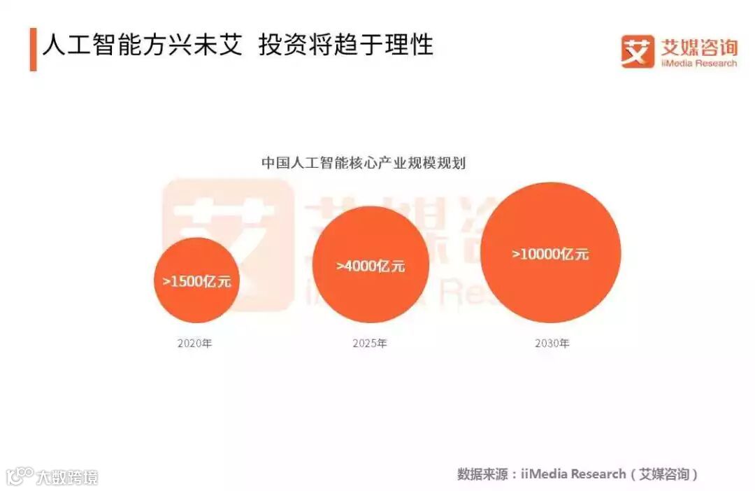 国务院印发的《新一代人工智能发展规划》提出,到2030年人工智能理论、技术与应用总体达到世界领先水平,核心产业规模超过1万亿元。艾媒咨询分析师认为,2017年,中国人工智能研究高速发展,吸引了大量资金投入,在多个领域有较好发展,初步的应用场景得到实现。未来人工智能技术商业化进程将进一步展开,资本投资也将趋于理性。