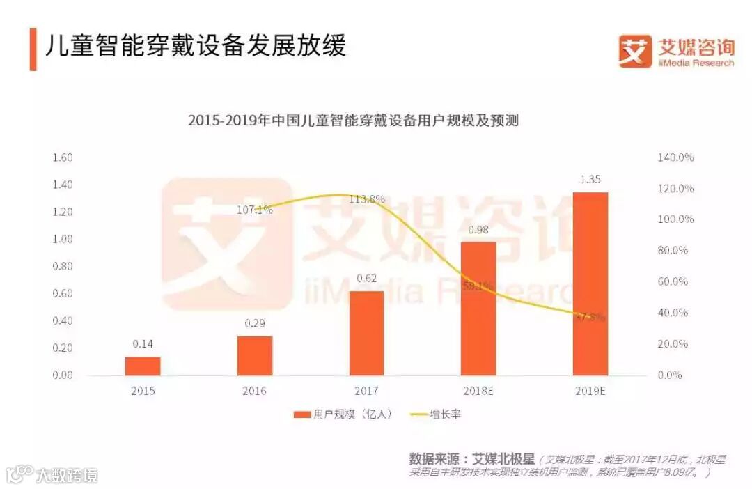 随着儿童智能穿戴设备技术进一步成熟,80后、90后群体逐渐晋升为家长,对新型产品的认可度高。儿童穿戴设备市场持续受利好因素刺激,在过去两年用户规模保持高增长率,现进入缓和期。