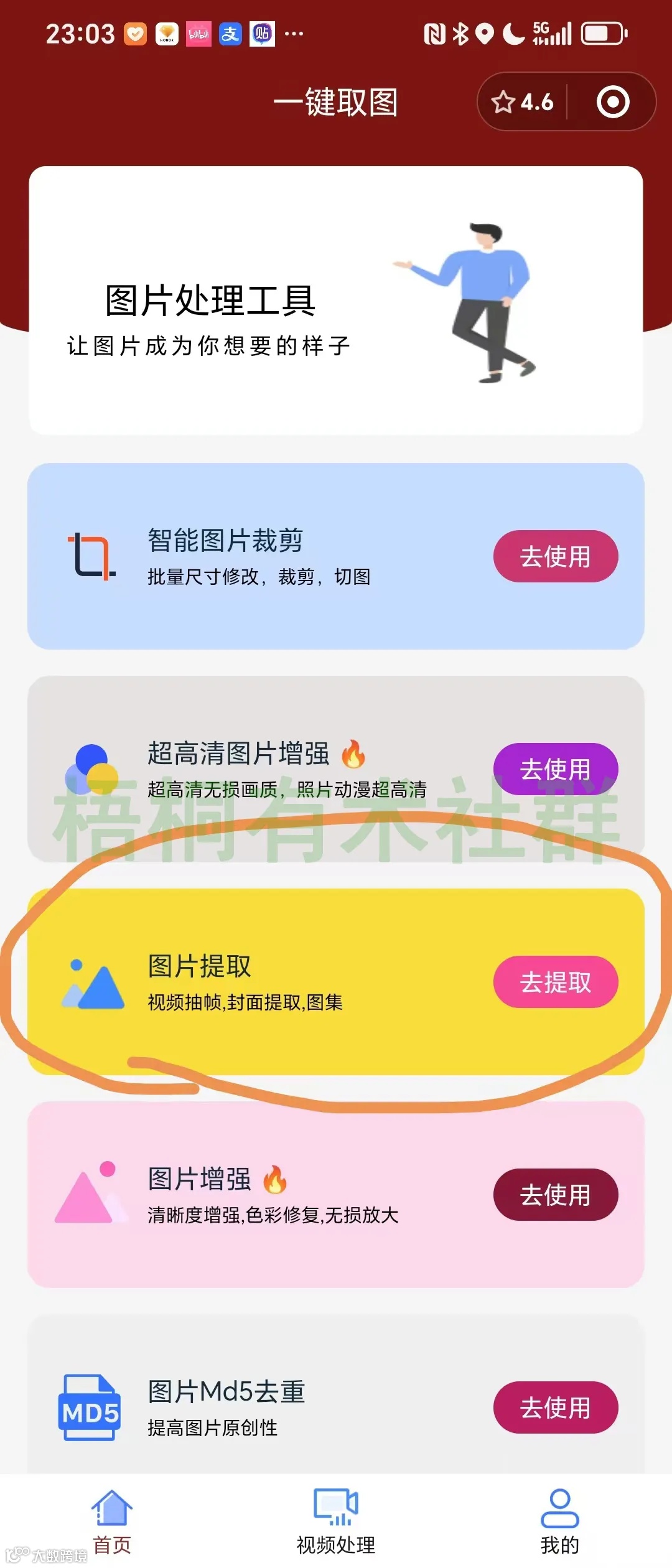 复制链接以后,咱们打开“一键取图”小程序,选择第三个,也就是“图片提取”,如图所示: