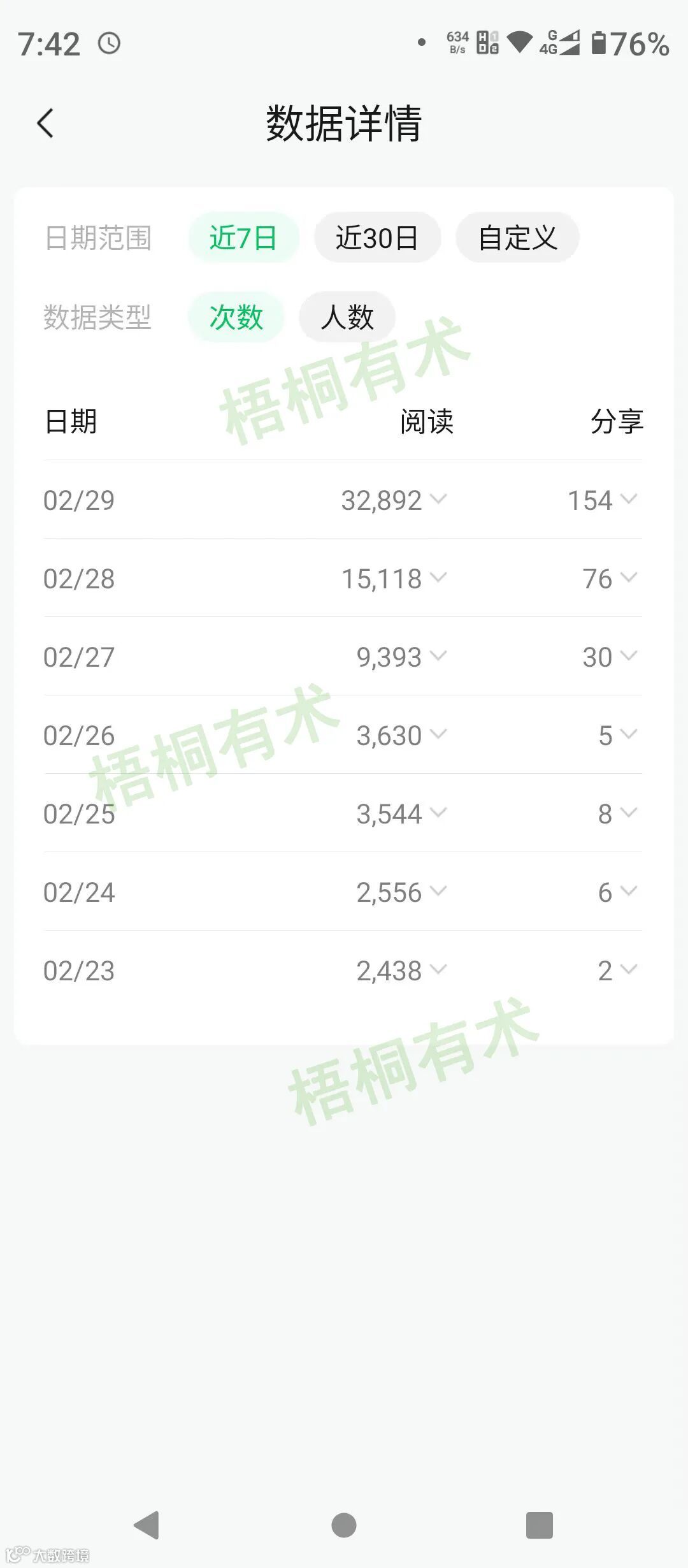 第一天只有2000多的阅读,第7天直接干到3万多的阅读,而他之前的公众号阅读一直都是两位数,用了咱们梧桐有术社群里面分享的方法以后,直接干到5位数阅读。