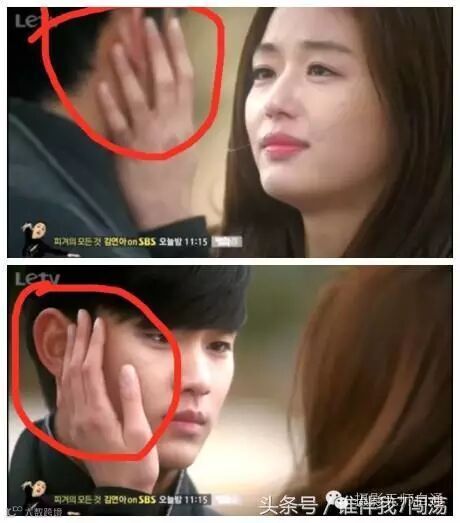《来自星星的你》第19集, 当千颂伊去摸都敏俊的脸时,从正面的镜头看只有小拇指在耳朵后面的,可是当切换到侧面时,却看到是两根手指在耳朵后面!这手法变的好快哦!