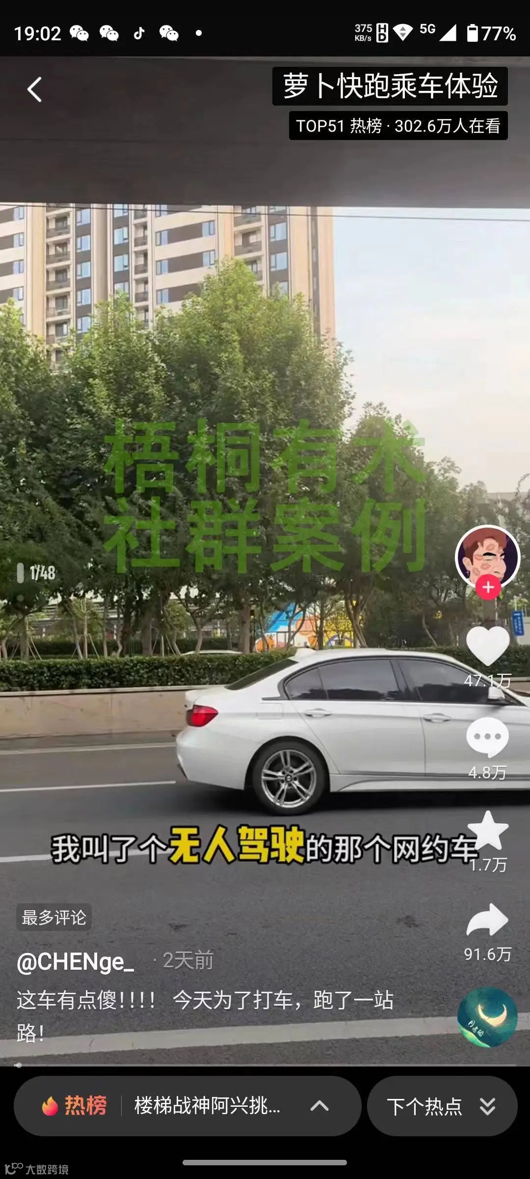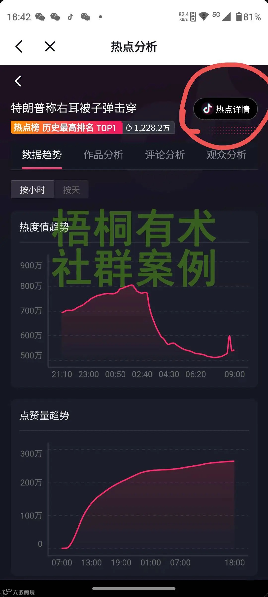 3、找到合适的话题,点击右上角的“热点详情”,就打开了热门视频,然后听一听视频里有明显的人声,有的话,方便咱们把视频里面的文字提取出来,没有的话,就换一个有人声的。