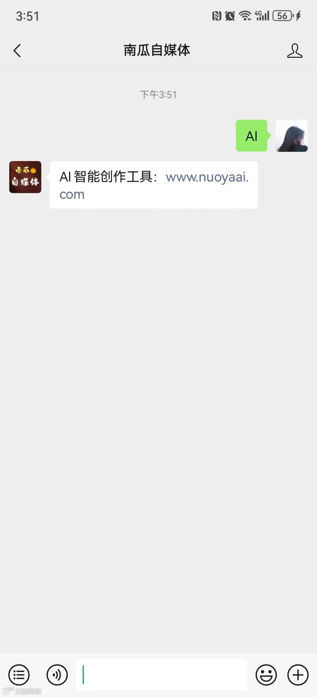 5、打开南瓜自媒体公众号,发送AI,会收到AI智能创作工具( www.nuoyaai.com ) 或者其他的AI工具,把文案复制到里面进行改写,改写以后,连截图带改写好的内容直接发布到微头条即可。如下图顺序: