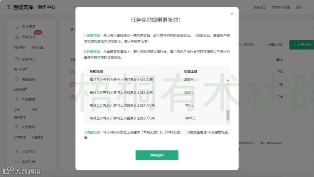 也就是说,咱们在前几个月只需要往文库上传资料,之后每个月只要有人通过你的资料购买文库会员,咱们就能拿到分成,起码每个月的烟钱、买排骨的钱、油盐米醋钱,还有买衣服、化妆品的钱就都有着落了。