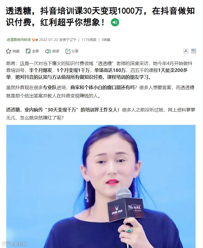 所以,这几年来,无论是抖音、快手还是各电商平台,视频课程简直卖爆了!更有牛人“透透糖”,靠卖课一个月挣了1000W,这是全网都知道的事情,以至于触碰太多同行的利益,被举报封号了一周,虽然现在没有那么高调了,但了解知识变现的博主都知道,她每个月收入不低于7位数。