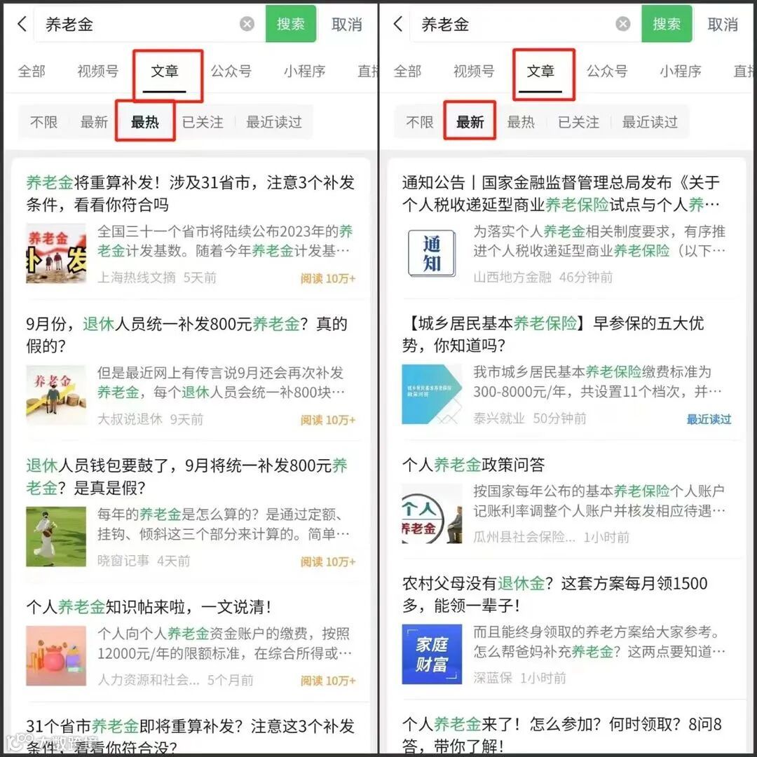 我们直接在微信搜关键词:养老金,然后选择最热或者最新,去了解一下养老金的新闻,标题方面,自己再稍微修改一下就OK了。