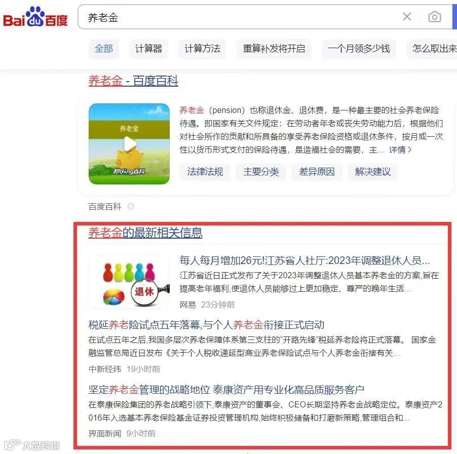 然后去百度搜索“养老金”三个字,找到一个星期之内的文章。