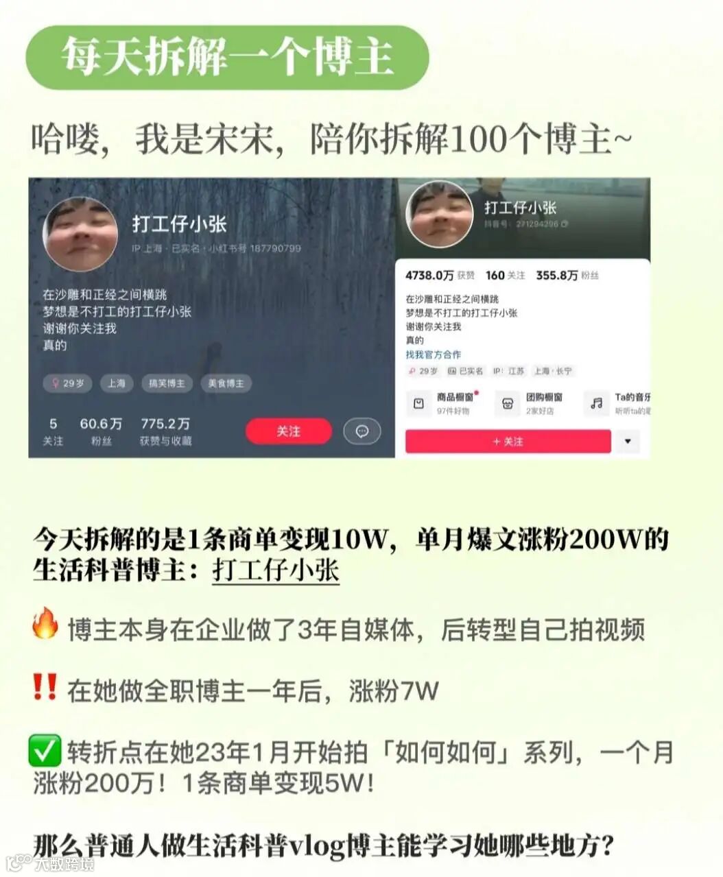 有一个博主,名字叫:打工仔小张,他在自媒体分享《如何如何》系列,她的主要变现路径就是接广,一条合作笔记报价是5万,这些数据都可以查的,你可以去查下。
