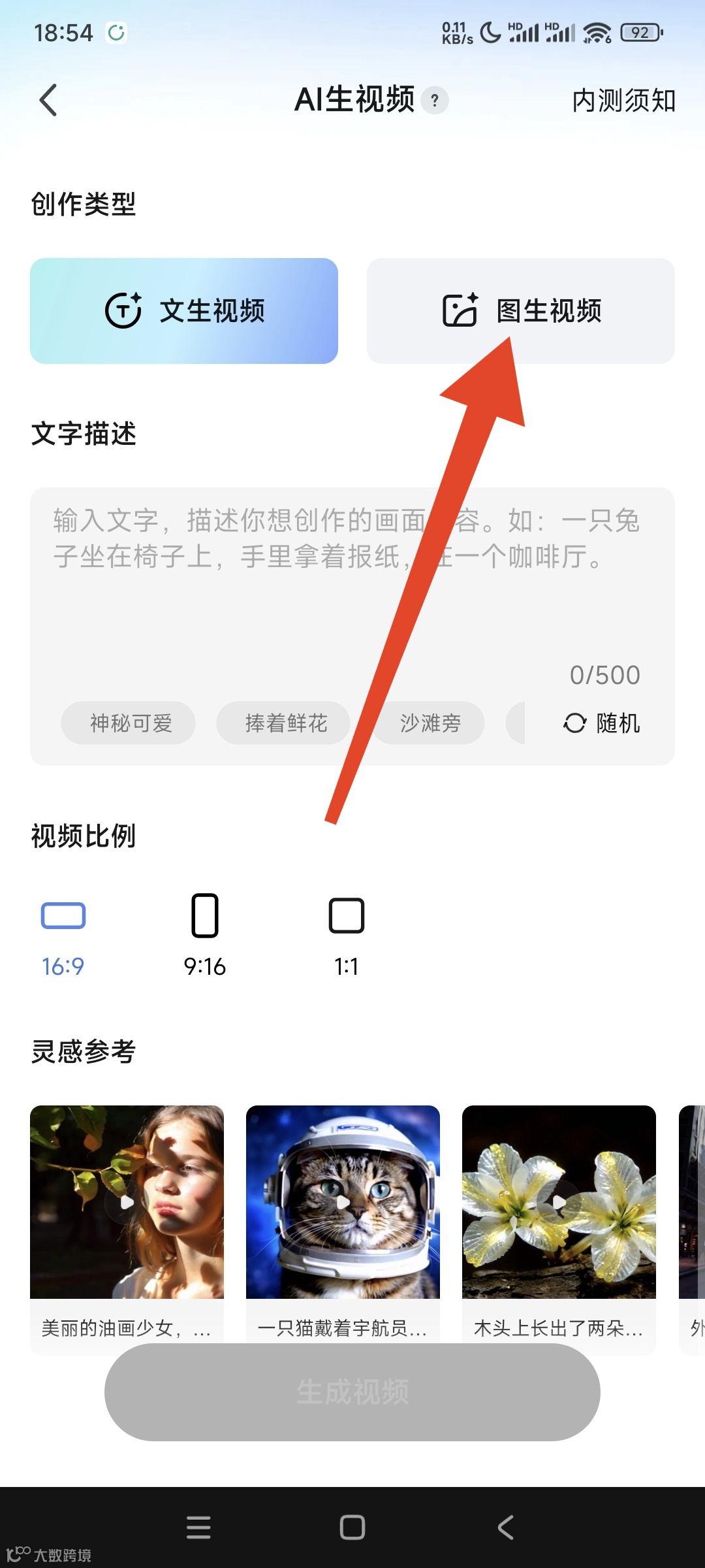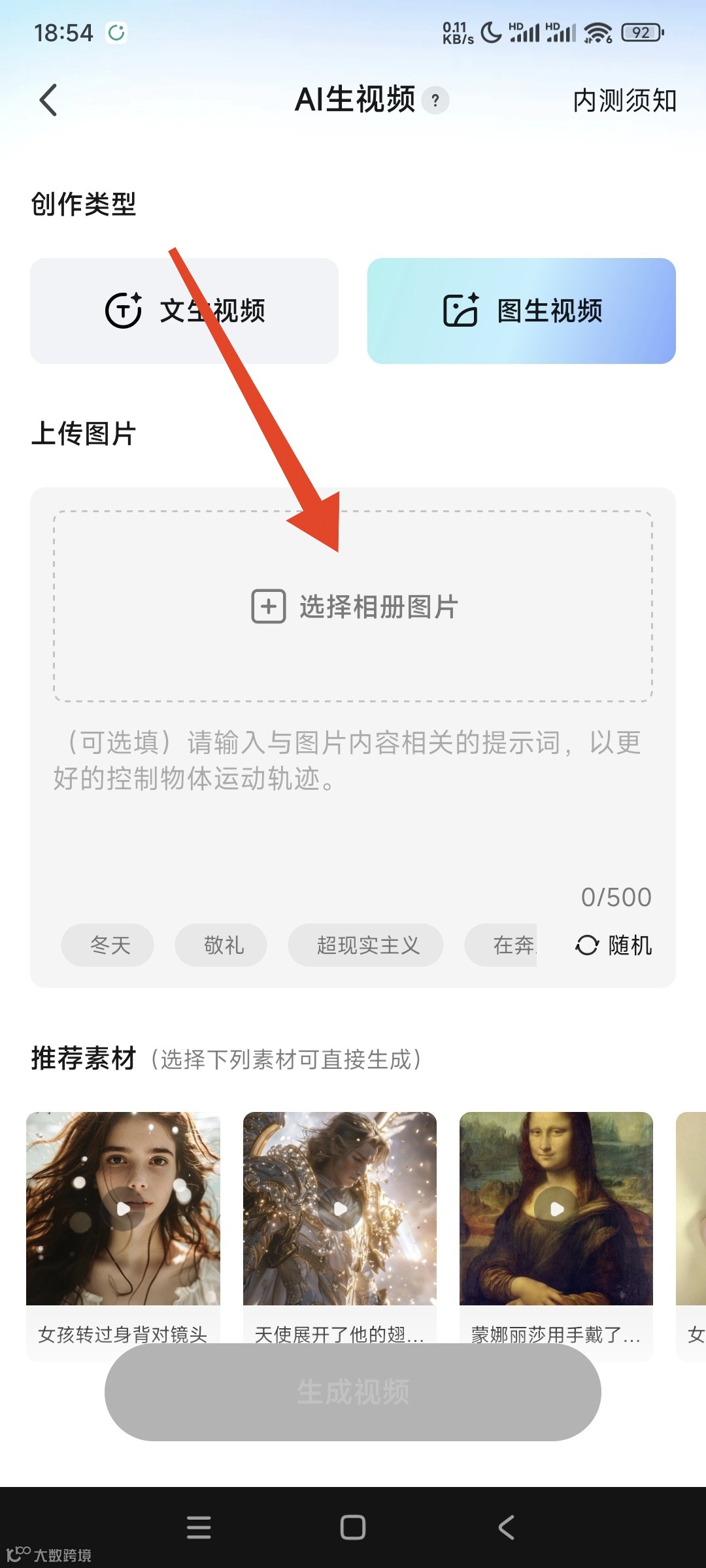 在图生视频时,可以填写提示词来手动控制人物的运动轨迹。也可以不填,不填生成的效果比较随机。