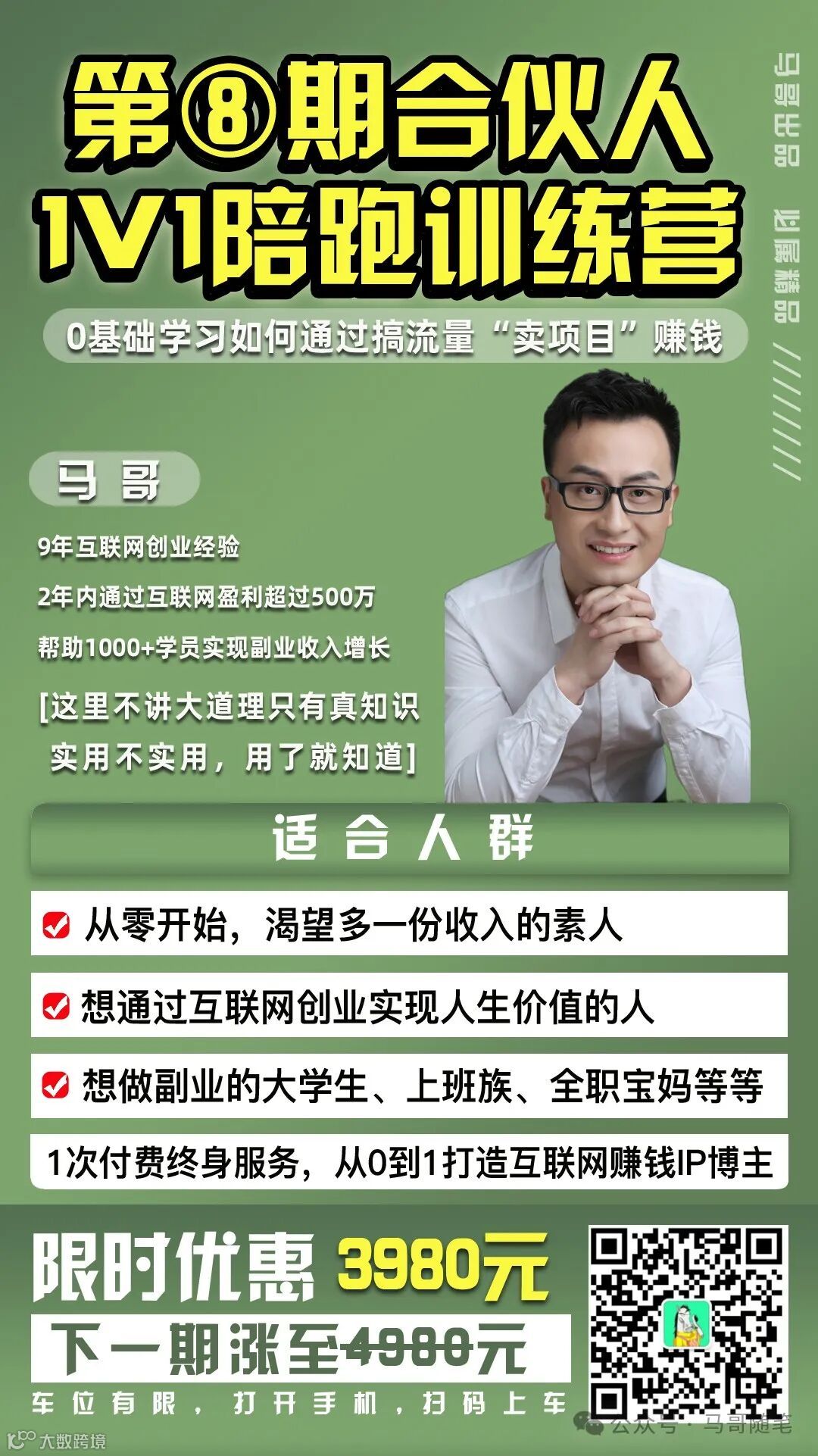 或者刚刚进入卖项目的领域,那么你很幸运。现在不用再花大笔学费,一举两得,转变思维,从事培训,做马哥合伙人。
