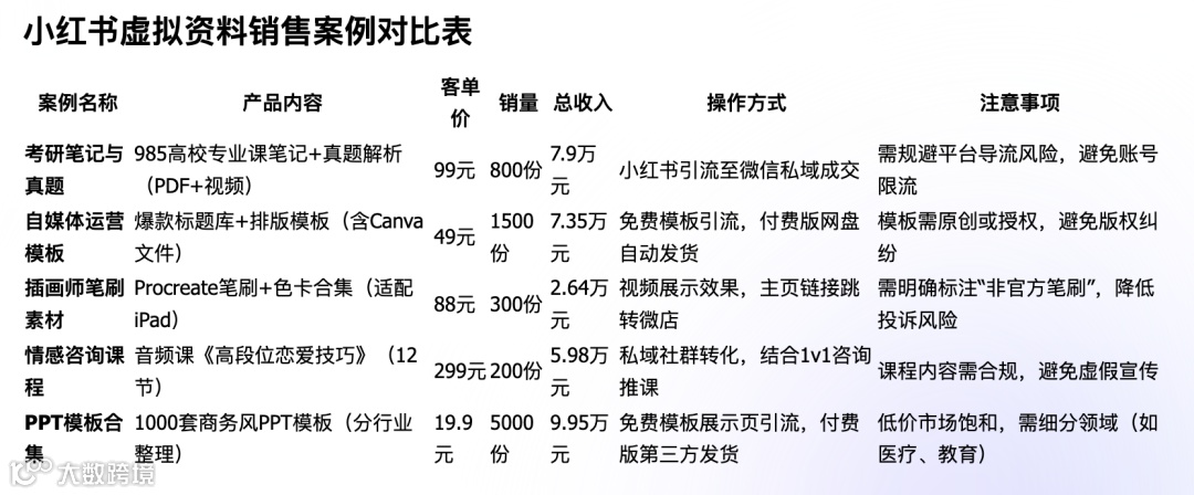 小红书卖虚拟资料的真实案例,帮我举出5个例子,包括卖的是什么资料,客单价多少,卖了多少份,挣了多少钱!