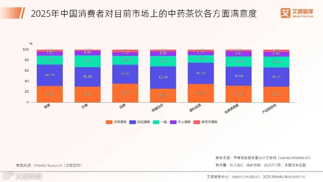根据全球新经济产业第三方数据挖掘和分析机构iiMedia Research(艾媒咨询)发布的《2025年中国中药茶饮行业发展状况与消费行为调查数据》显示,在2025年中国消费者对中药茶饮的满意度调查中,品牌“非常满意”的比例最高,为35.70%。其次是原料品质,占比35.19%。价格的“非常满意”比例为30.12%,而“非常不满意”的比例最低,为2.37%,显示出消费者对价格的总体满意度较高。包装美观度、味道和产品创新性的“非常满意”比例均在30%左右,而“非常不满意”的比例均低于5%,表明消费者对这些方面的满意度较为均衡。整体来看,消费者对中药茶饮的满意度较高,尤其是品牌和原料品质方面。