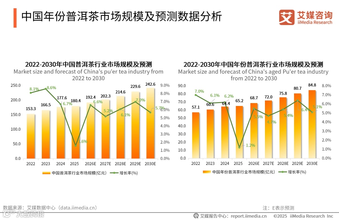 年份普洱茶作为茶叶品类中的佼佼者,以其随着时间陈化而愈发醇厚的口感、丰富的养生保健功效,以及深厚的文化底蕴,吸引了越来越多消费者的目光,已然成为茶叶市场中炙手可热的细分领域。全球新经济产业第三方数据挖掘和分析机构iiMedia Research(艾媒咨询)发布的《2025年中国年份普洱茶行业现状及消费趋势洞察报告》显示,未来中国普洱茶行业市场规模将整体平稳上升,预计到2030年,普洱茶市场规模将达到242.6亿元,年份普洱茶市场规模将达84.8亿元。