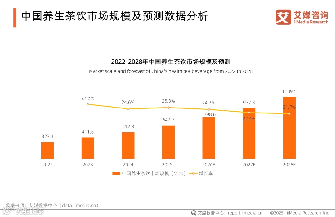 根据全球新经济产业第三方数据挖掘和分析机构iiMedia Research(艾媒咨询)发布的《2025-2026年中国养生茶饮行业现状研究及消费者洞察报告》显示,2025年中国养生茶饮市场规模达642.7亿元,同比增长25.3%,预计2028年将突破千亿元。