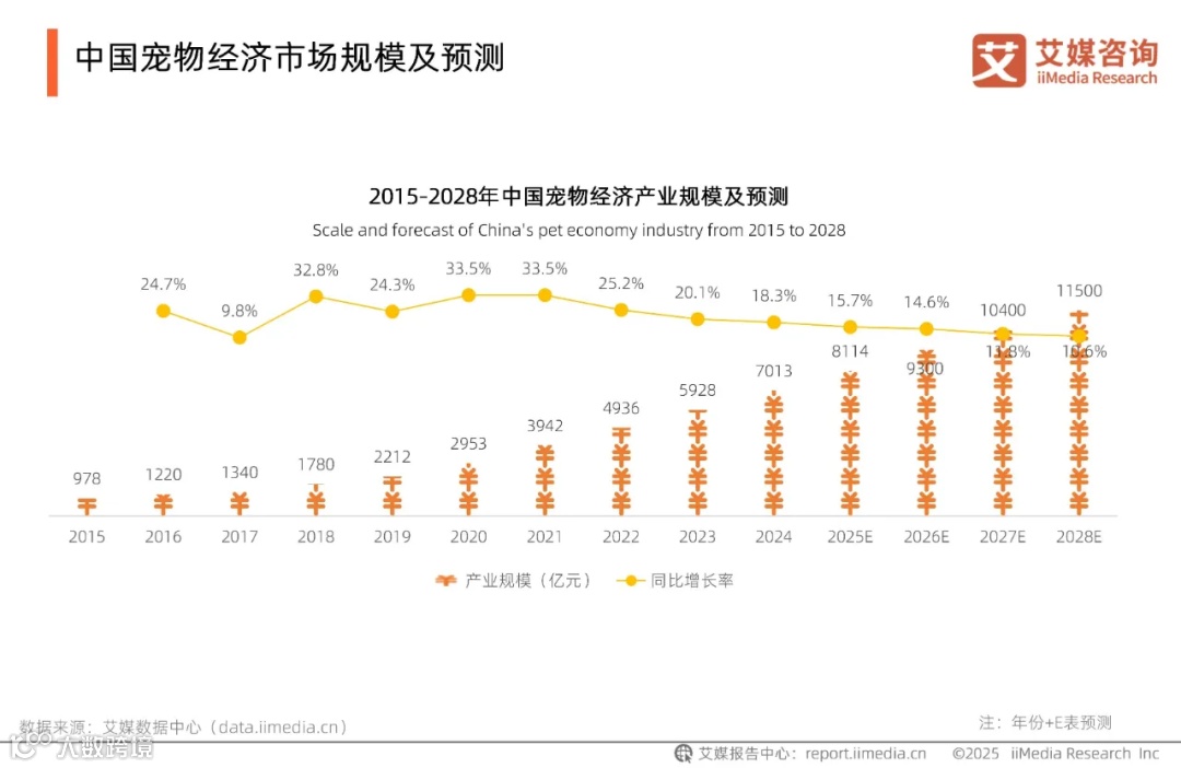 全球新经济产业第三方数据挖掘和分析机构iiMedia Research(艾媒咨询)发布的《2025-2028年中国情绪消费与宠物产业生态商机研究报告》数据显示,2025年中国宠物经济产业规模达8114亿元,同比增长15.7%,预计到2028年有望突破11500亿元。