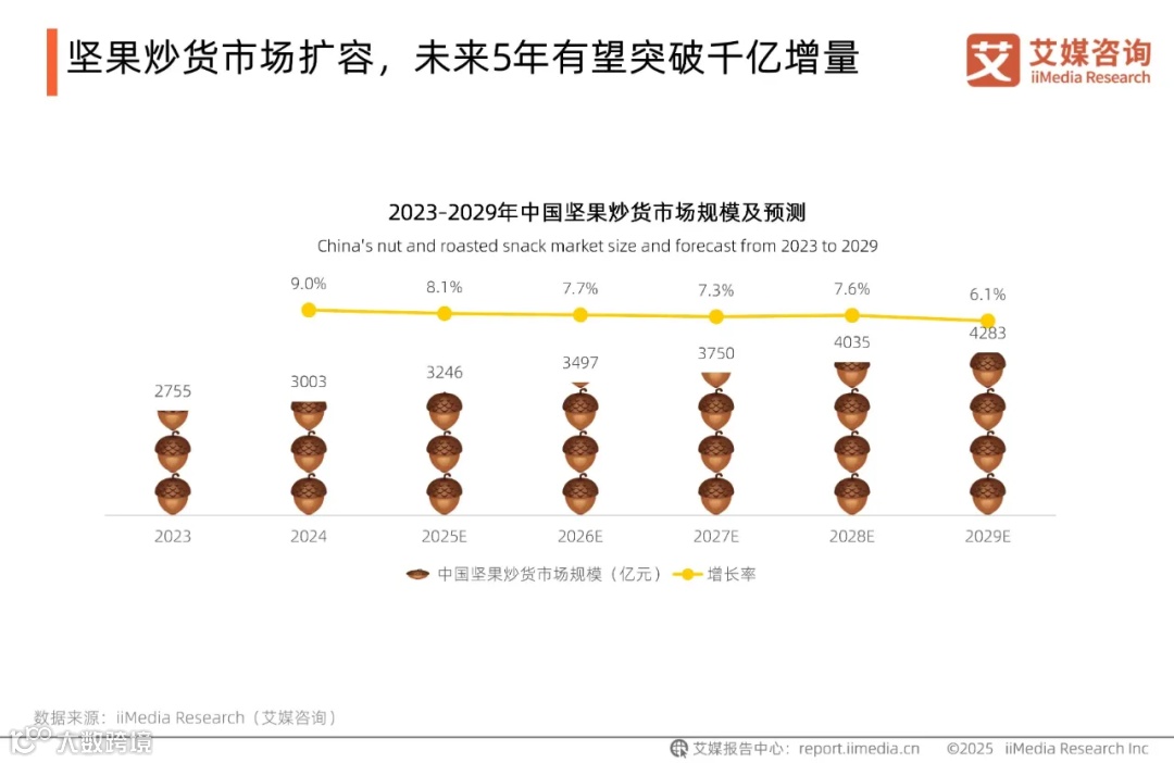 全球新经济第三方数据挖掘和分析机构iiMedia Research(艾媒咨询)发布的《2025-2026年中国坚果炒货市场发展现状及消费趋势洞察报告》数据显示,2024 年中国坚果炒货市场规模已突破3000亿元;预计到2029年,这一规模将进一步攀升至4283亿元,5年间有望形成超千亿的增量空间。