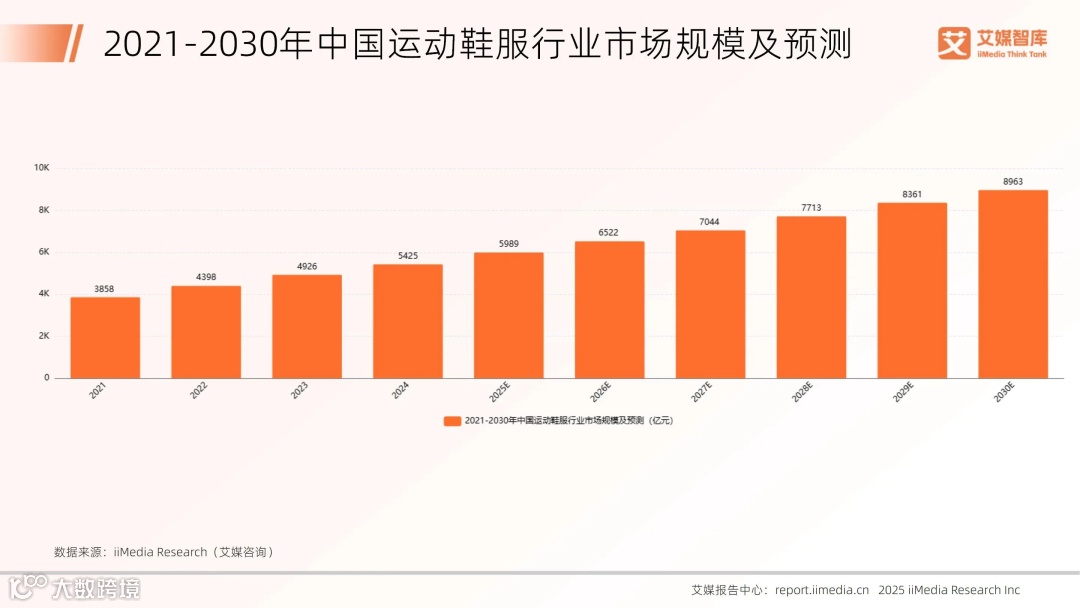 全球新经济产业第三方数据挖掘和分析机构iiMedia Research(艾媒咨询)发布的《2025年中国运动鞋服行业发展状况与消费行为调查数据》数据显示,2024年中国运动鞋服行业市场规模为5425亿元,预计2030年将达到8963亿元。