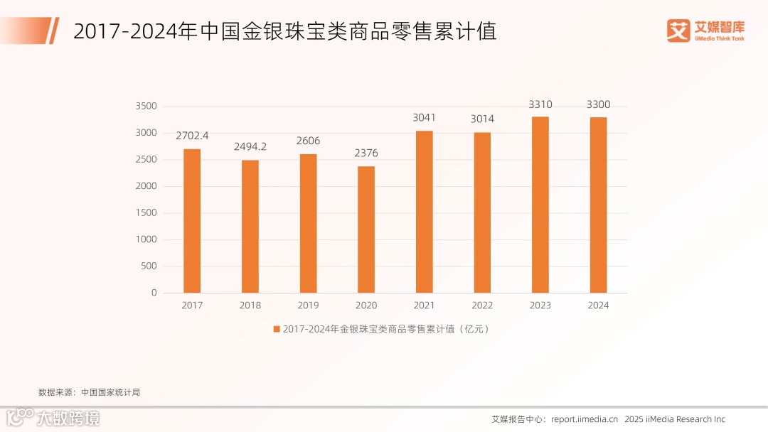 全球新经济产业第三方数据挖掘和分析机构iiMedia Research(艾媒咨询)发布的《2025年中国饰品行业发展状况与消费行为调查数据》数据显示,2024年中国金银珠宝类商品零售累计值为3300亿元,虽同比下降3.1%,但仍稳守3000亿元以上的历史高位。尽管面临一定的市场波动,中国饰品市场仍展现出强大的发展韧性与稳定的基本盘,消费者对珠宝饰品的需求依然保持稳定。