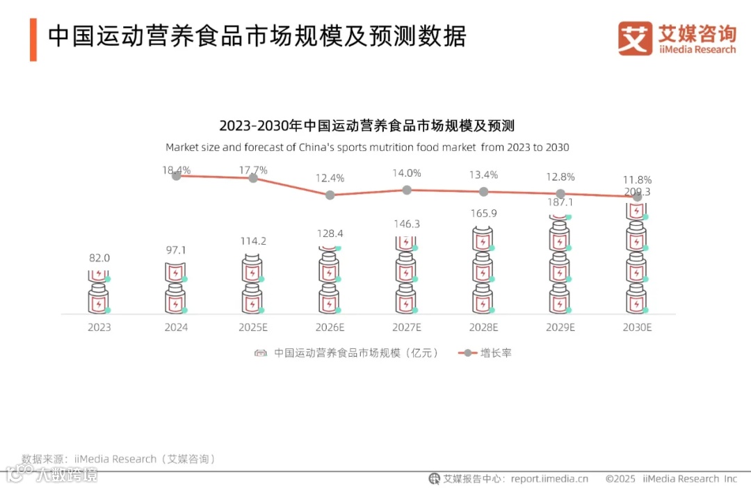 全球新经济产业第三方数据挖掘和分析机构iiMedia Research(艾媒咨询)发布的《2025-2026年中国运动营养食品市场消费趋势研究报告》数据显示,2024年中国运动营养食品市场规模达97.1亿元,预计到2030年将增至209.3亿元,6年间有望实现规模翻倍。