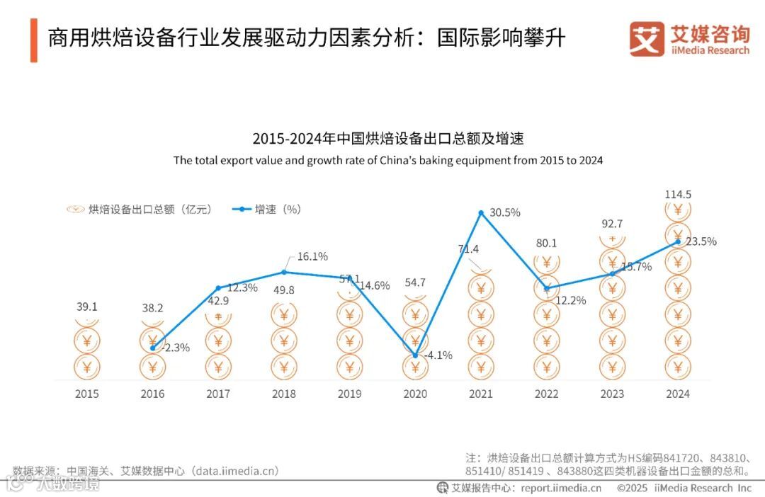 数据显示,中国烘烤设备的出口总额整体呈扩张态势,出口总额持续攀升,2015年至2024年的出口总额从39.1亿元升至114.5亿元。艾媒咨询分析师认为,这反映出行业通过技术迭代与产能优化提升了国际竞争力,契合了海外烘焙消费市场需求的释放节奏,也体现了全球化布局在产业链协同发展下的稳步推进。未来,在海外需求延续与国内产业升级的双重驱动下,出口增长势能有望持续保持。