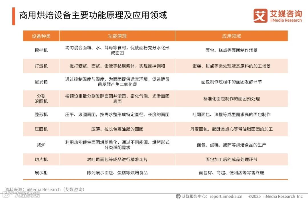 商用烘焙设备是指用于规模化生产面包、蛋糕、披萨、中式糕点等各类烘焙食品的机械设备以及相关展示设备。这类设备以满足商业场景中的高效生产、标准化品控和多样化需求为核心目标,广泛应用于面包店、中式糕点店、超市卖场、便利店、酒店、西餐厅、快餐店、茶饮咖啡店等餐饮零售场所,以及中央烘焙工厂、中央厨房、食品烹饪培训学校等非零售场所。其功能覆盖原料处理、成型、发酵、烘烤、展示等全流程,具有自动化程度高、产能稳定、耐用性强等特点,是烘焙产业工业化与专业化发展的重要支撑。
