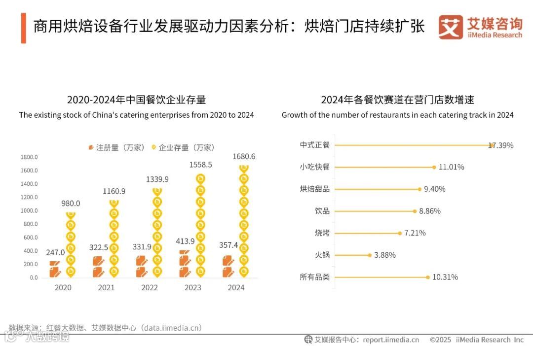 数据显示,2020-2024年全国餐饮企业存量从980.0万家增长至1680.6万家,整体规模接近翻番。2024年,烘焙甜品以9.40%的门店增速稳居餐饮品类第一梯队,高于饮品、火锅等品类,但略低于小吃快餐及中式正餐。艾媒咨询分析师认为,随着餐饮企业数量激增及烘焙门店的高速扩张,设备需求持续向自动化、高效能升级。烘焙品类的高增长与餐饮连锁化趋势,也将促使设备向定制化、多功能集成方向迭代。