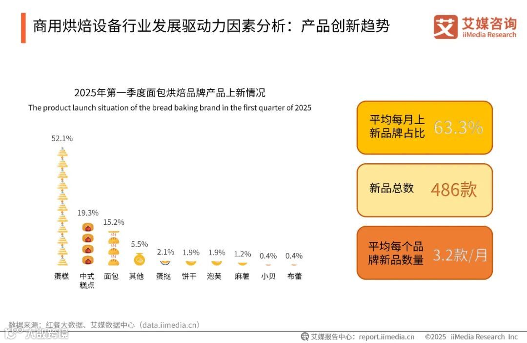 数据显示,2025年第一季度,面包烘焙样本品牌平均每月上新品牌占比达到63.3%,新品总数达到486款,平均每个品牌新品数量为3.2款/月。从产品类别来看,蛋糕类新品最多,占面包烘焙新品总数的52.1%。艾媒咨询分析师认为,消费端对产品差异化和健康化的需求传导至设备层,驱动企业研发模块化、智能化设备以缩短生产周期。商用烘焙设备商需联动下游开发场景适配技术,同时提升能耗与品控效率,降低中小品牌创新成本。