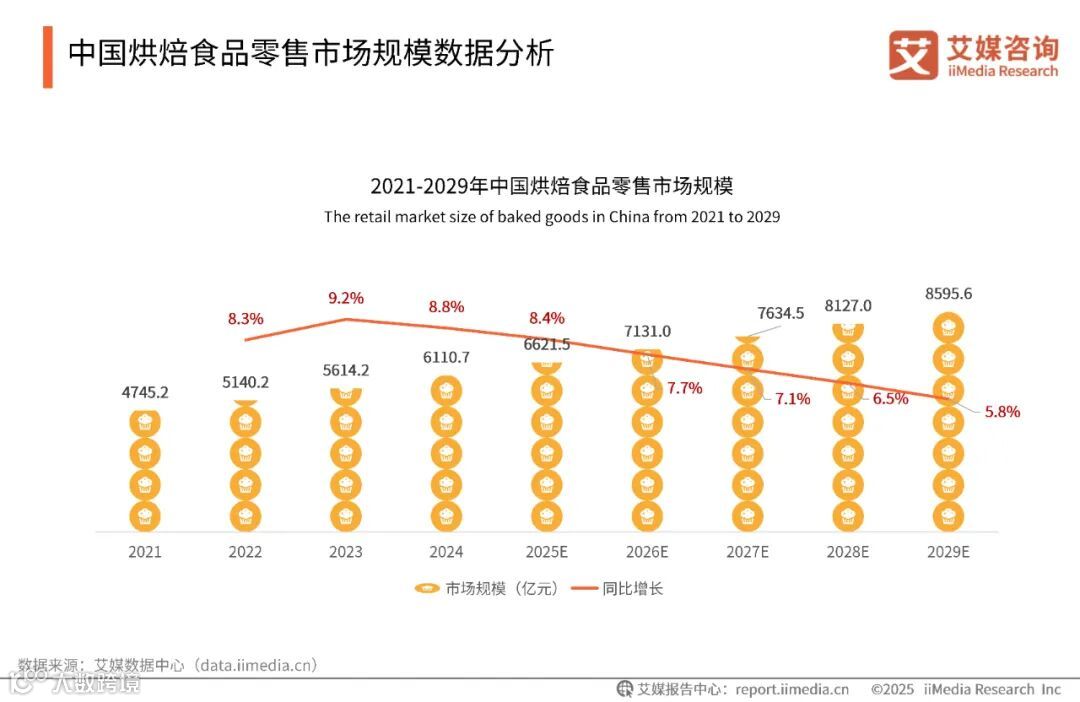 iiMedia Research(艾媒咨询)数据显示,2024年中国烘焙食品零售市场规模已达到6110.7亿元,预计2025年中国烘焙食品零售市场规模达6621.5亿元,同比增长8.4%。随着人均消费水平的增长,以及餐饮消费结构调整,中国烘焙食品零售市场将持续扩容,预计2029年市场规模将达8595.6亿元。中国烘焙食品行业细分市场潜力巨大,随着自媒体的不断发展,各类网红探店、KOL推荐等促使中式糕点、新中式糕点成为新热点,发展势头强劲。