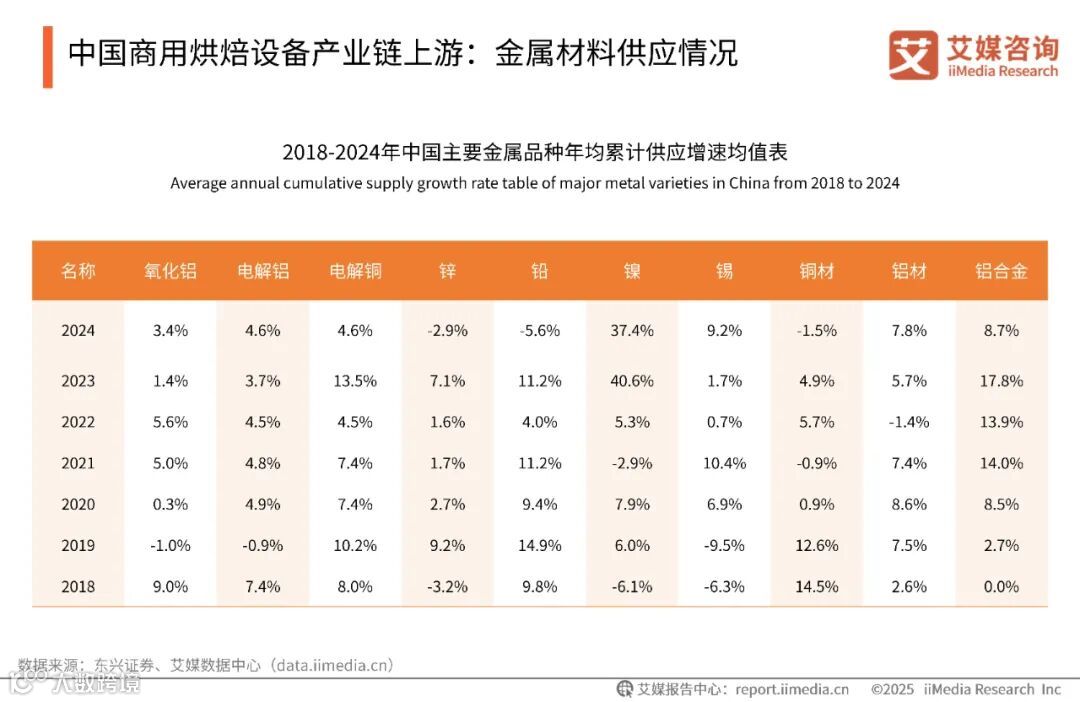 数据显示,受全球新能源需求拉动,2024年镍、锡、铝合金等新能源及电子关联金属增速显著;而铜材、电解铜等传统工业金属增速放缓,反映基建需求趋弱。艾媒咨询分析师认为,商用烘焙设备企业需关注材料成本结构变化,优先采用供应充足且轻量化的铝合金,并应对不锈钢(含镍)等原材料可能的价格波动,通过供应链多元化增强抗风险能力。